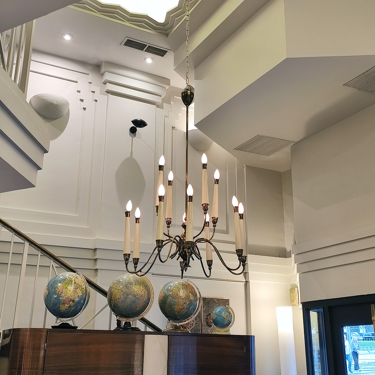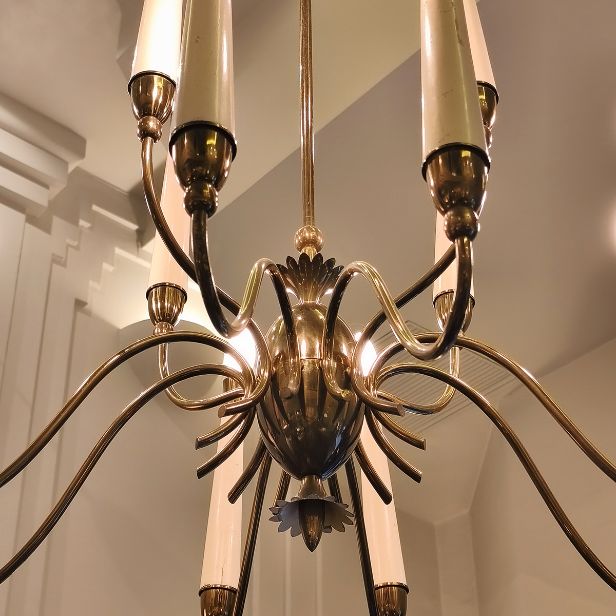 Esta lámpara de techo es un diseño italiano de los años 50, realizada en latón con los brazos esmaltados en color crema, muy acorde con el gusto italiano de esos años. La estructura parte de la forma tradicional del candelabro, con más de una docena de brazos que arrancan de la clave central, y se abren hacia arriba de manera sinuosa y elegante. Una lámpara espectacular, con un diseño moderno y calidad irrepetibles.