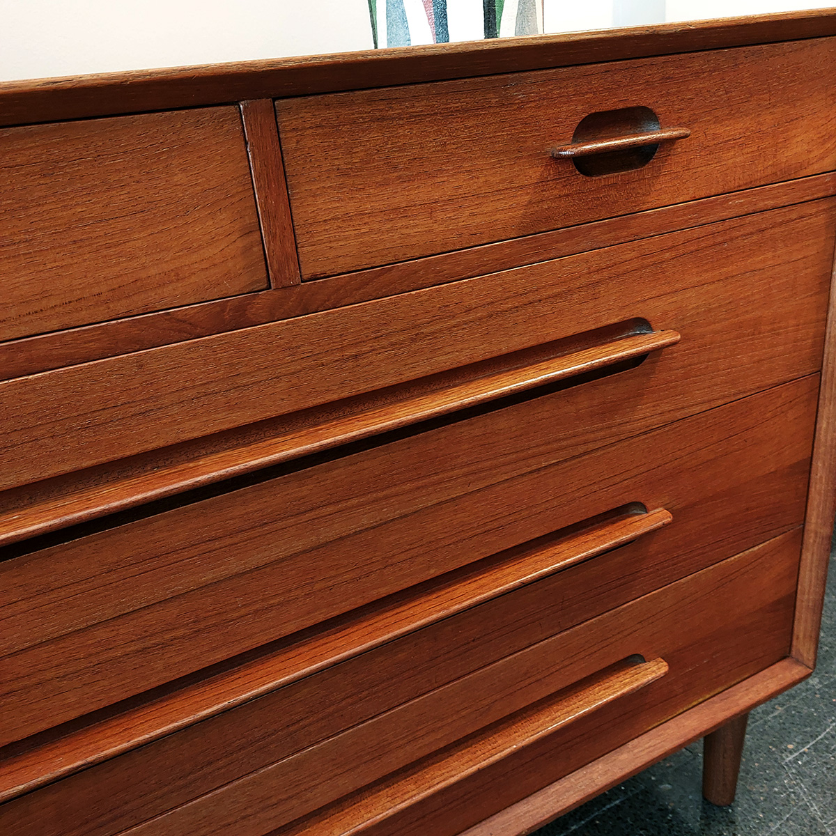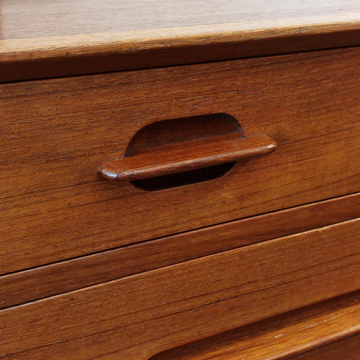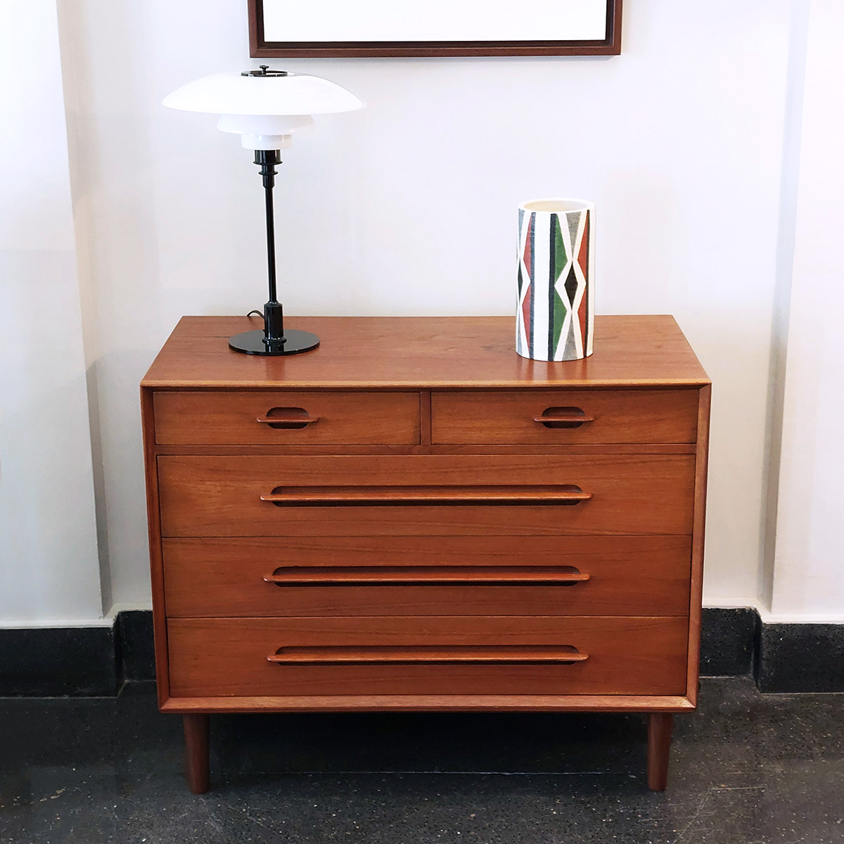 La cómoda diseñada por Edvind Johansson en los años 60, cumple a rajatabla con la estética funcional y purista del diseño danés. Muebles que ante todo, son de alta calidad, funcionales y aptos para el uso diario. Realizada en madera de teca, cuenta con tres cajones , más una primera fila con dos más pequeños. Resaltan los tiradores, alargados, marcando la simpleza decorativa. Una fórmula sencilla, pero auténtica, del clasicismo nórdico. Atemporal.
